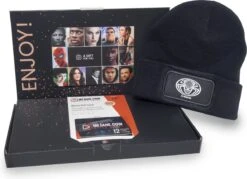 Zwarte Spider-Man beanie. Mooi vormgegeven filmbox met zwarte Spider-Man gebreide muts -beperkte oplage- met een filmtegoedkaart. Superleuk om cadeau te geven voor hem of haar.