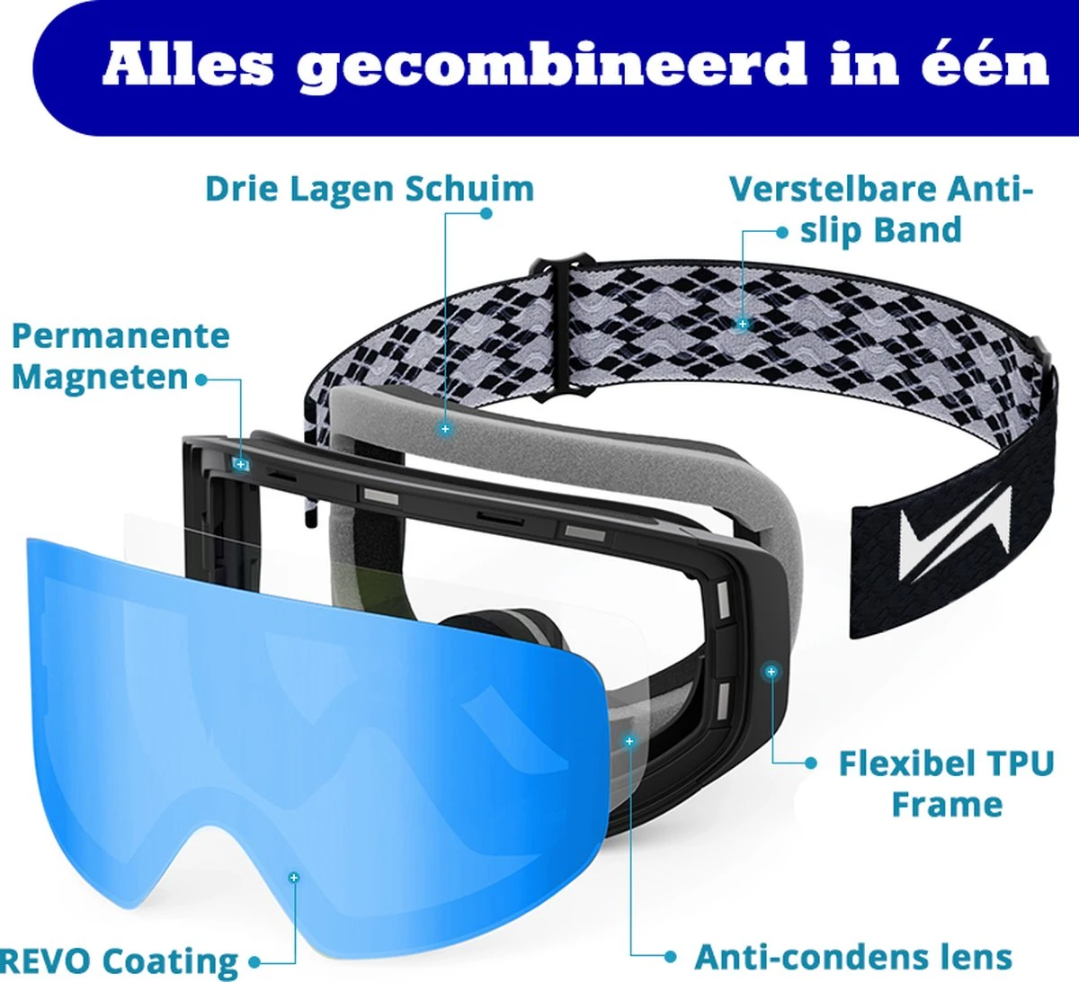 - Een Stevige EVA case met fluwelen binnenkant, waar je je skibril veilig in kan opbergen.