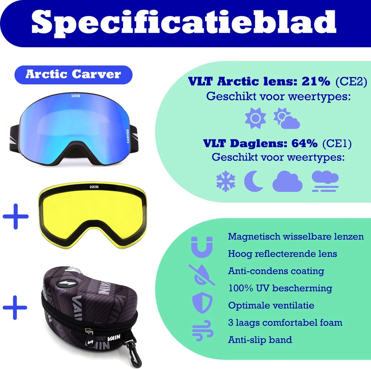 - Bonus lens: Gele Daglens voor bewolkt weer, sneeuw en nacht skiën.